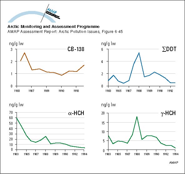 Temporal trends in OC levels (ng/g lw) in reindeer from Abisko, Sweden Levels are usually based on a pool of 10 samples