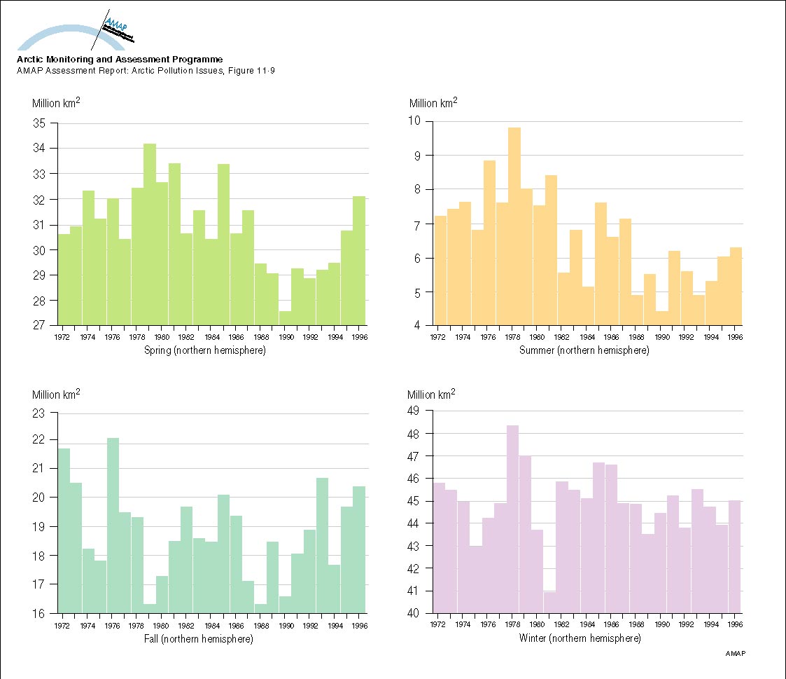 Snow cover over northern hemisphere lands between 1972 and 1996 for different seasons Values are determined from analyses of NOAA snow charts created using visible satellite imagery