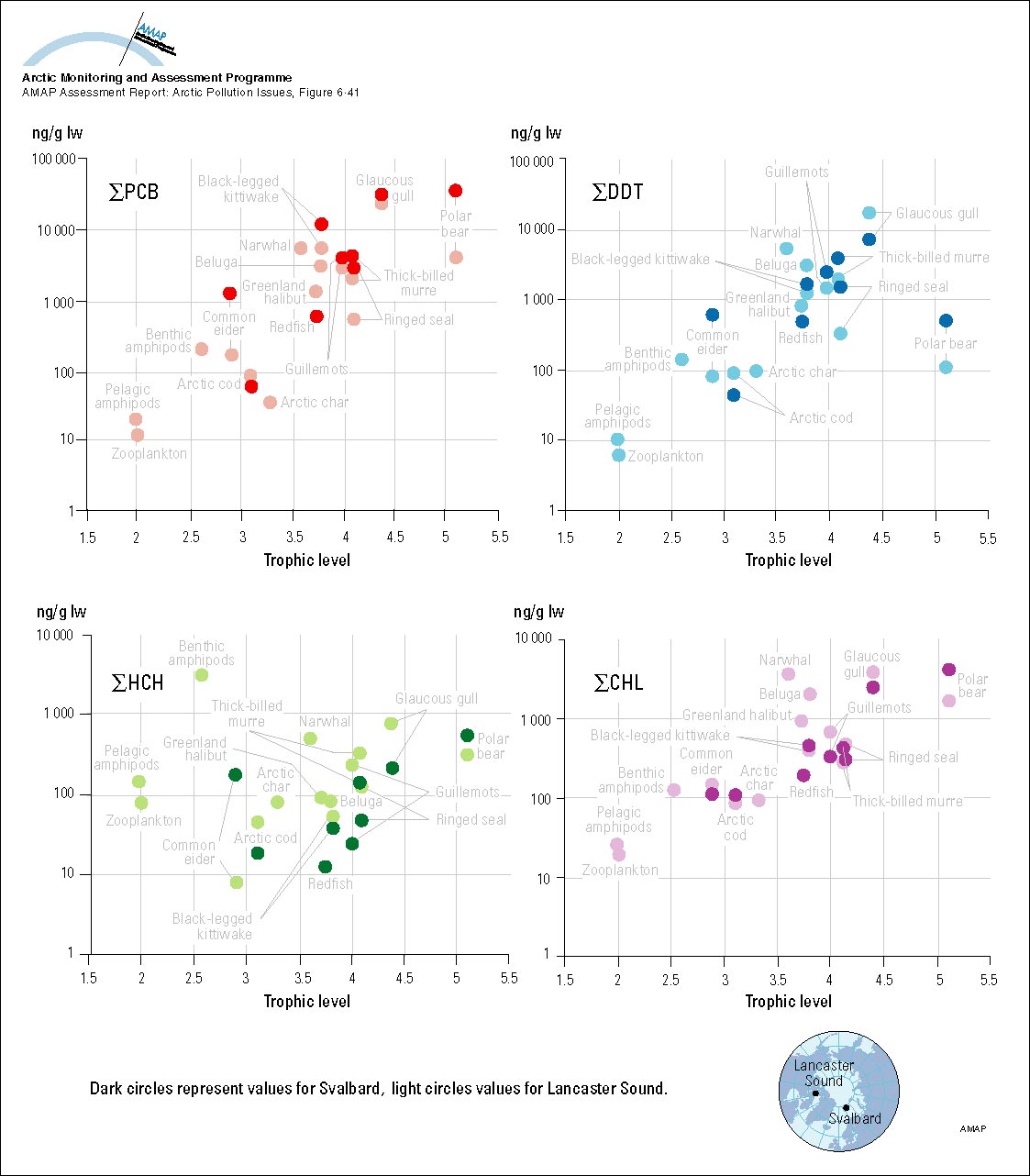 Correlations between concentrations (lw) of major persistent OCs and trophic level in the marine food web for Svalbard and Lancaster Sound Trophic level data were assigned based on Hobson and Welch (1992)