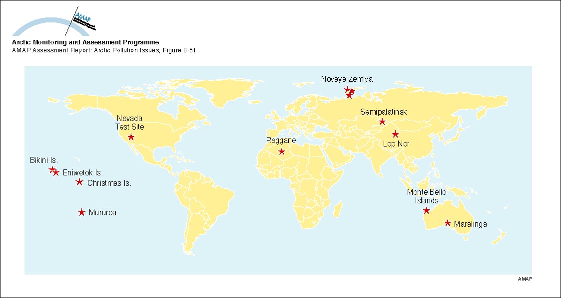 Sites where atmospheric testing of nuclear weapons has taken place since 1945