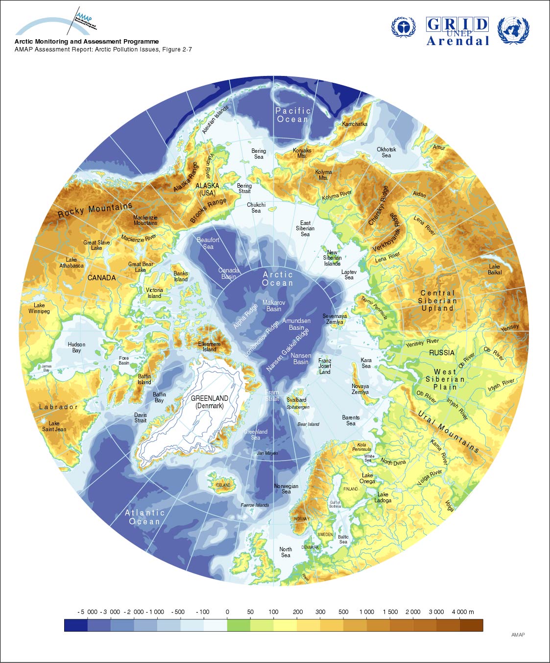 Topography and bathymetry of the Arctic (based on the ETOPO5 data set)