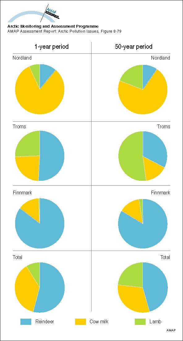 The comparative importance of different foodstuffs as sources of 137Cs for the three Arctic Norwegian counties over the 1-year and 50-year period following an assumed uniform deposition of 100 kBq/m2