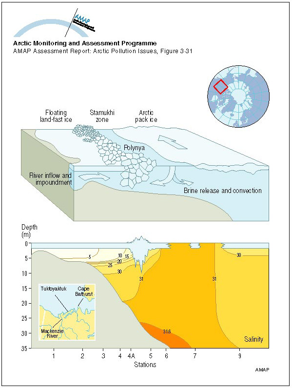 A schematic diagram showing the inflow from the Mackenzie River trapped in the nearshore zone beneath the landfast ice Beyond the stamukhi zone, intermittent opening and refreezing in the flaw lead produces brine which encourages mixing and convection