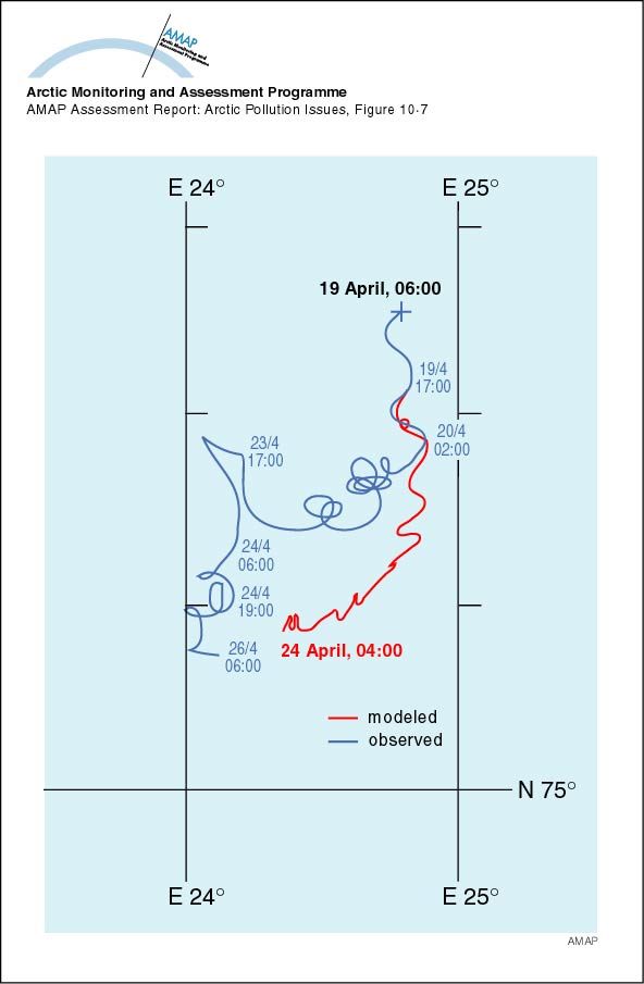 Sunde, J., E.A. Martinsen, Ø. Johansen and S. Vefsnmo, 1995. Oil spill in ice model development. The prototype of the operational system - Summary report. Norwegian Meteorological Institute, Oslo, Rept. No 16, 36p. (AAR Figure 10.7)