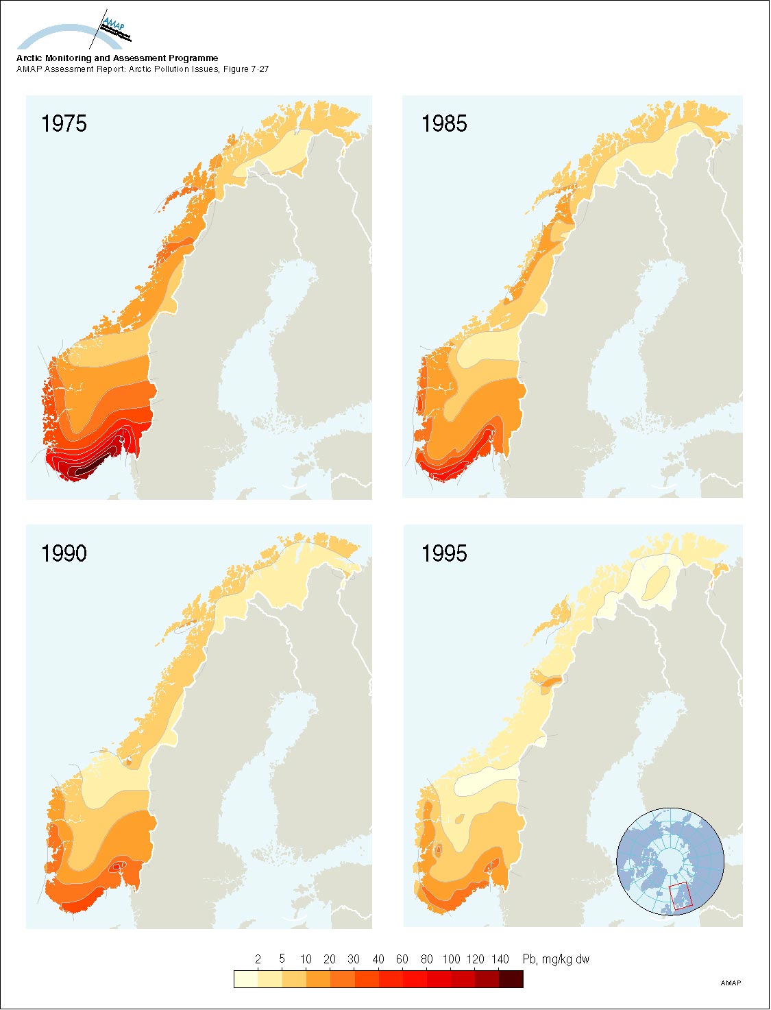 Latitudinal gradient of deposition of Pb in Norway in different years, as reflected by Pb concentrations in moss