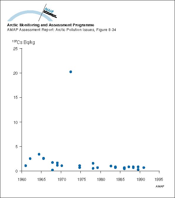 Changes with time in 137Cs activity concentration in whales from Greenland waters