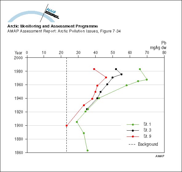 Lead in sediments near the cryolite mine at Ivittuut, south Greenland Stations 1, 3 and 9 are located at distances of 800 m, 1600 m and 5600 m, respectively, from the mine