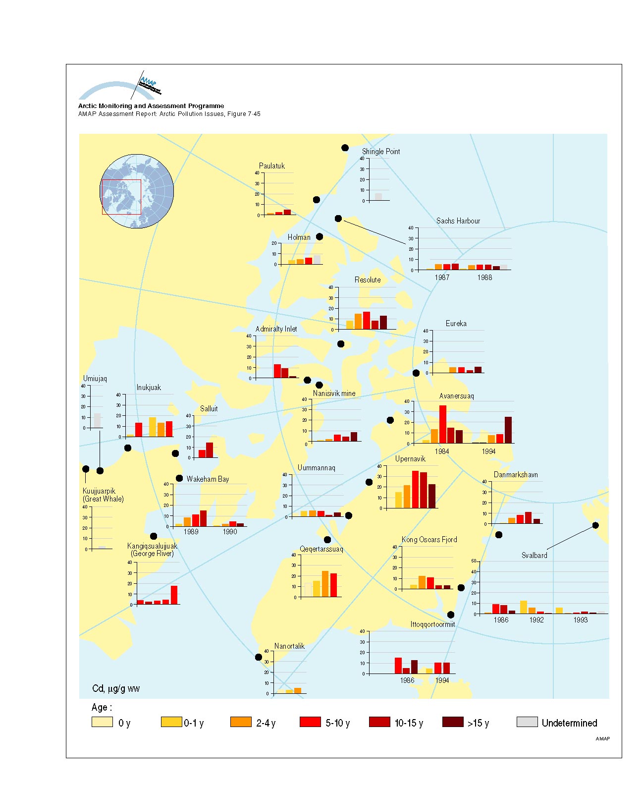 Distribution of Cd levels in liver tissue of ringed seal (Phoca hispida) of different ages Plots show selected data (geometric mean values) from Annex Table 7A15
