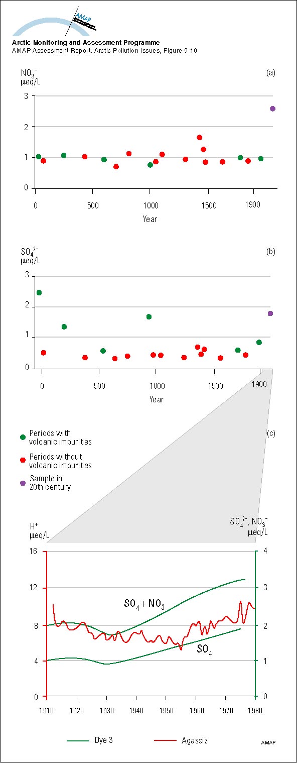 Historical records of a) NO3- and b) SO42- concentrations from the Greenland icecap at Dye 3 c) A comparison of trends in the average SO42- and SO42- plus NO3- concentrations at Dye 3 in Greenland and in the annual mean H+ concentration from Agassiz ice