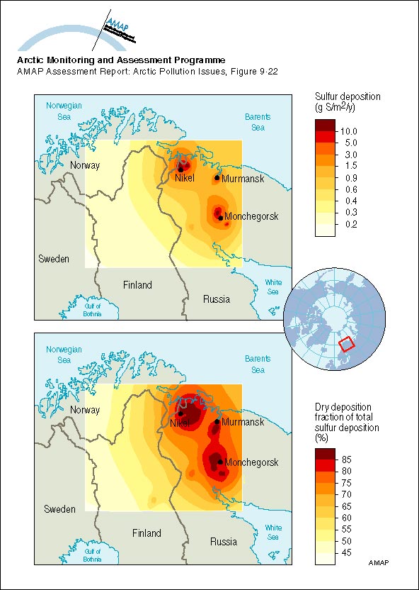 modified from: Tuovinen, J.-P., T. Laurila, H. Lättilä, A. Ryaboshapko, P. Brukhanov and S. Korolev, 1993. Impact of the sulphur dioxide sources in the Kola Peninsula on air quality in northernmost Europe. Atmos. Environ. 27A: 1379-1395. (AAR Figure 9.22)