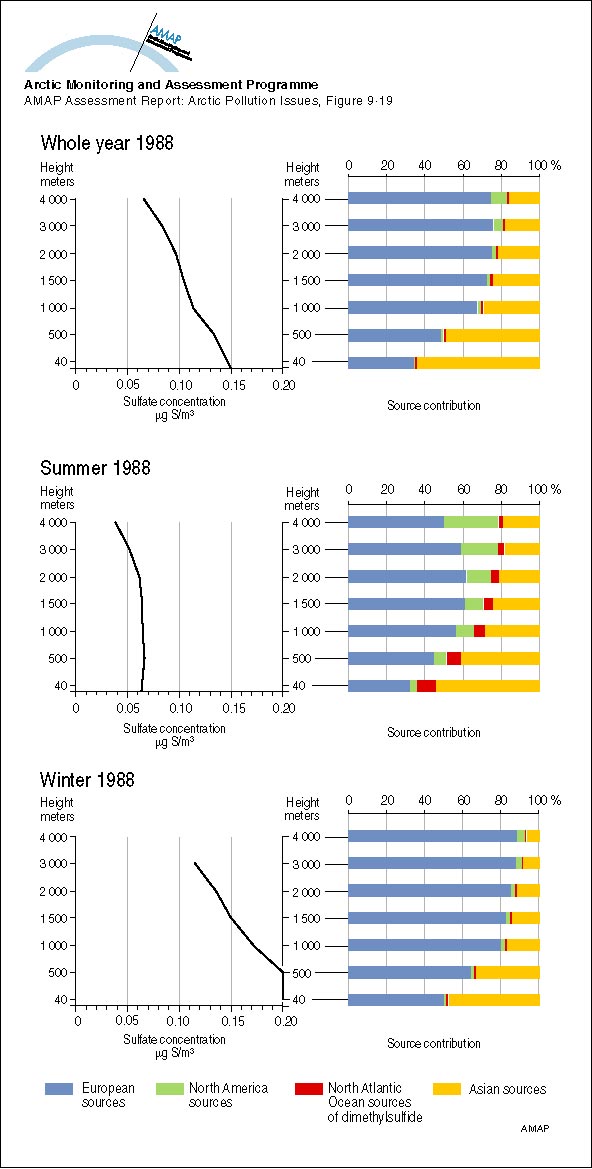 Vertical distribution of Arctic haze in summer, winter, and the whole year Sulfur air concentrations and relative source-contribution (%) for different heights above the ground are shown The concentrations are averages over the Arctic area north of 70°N
