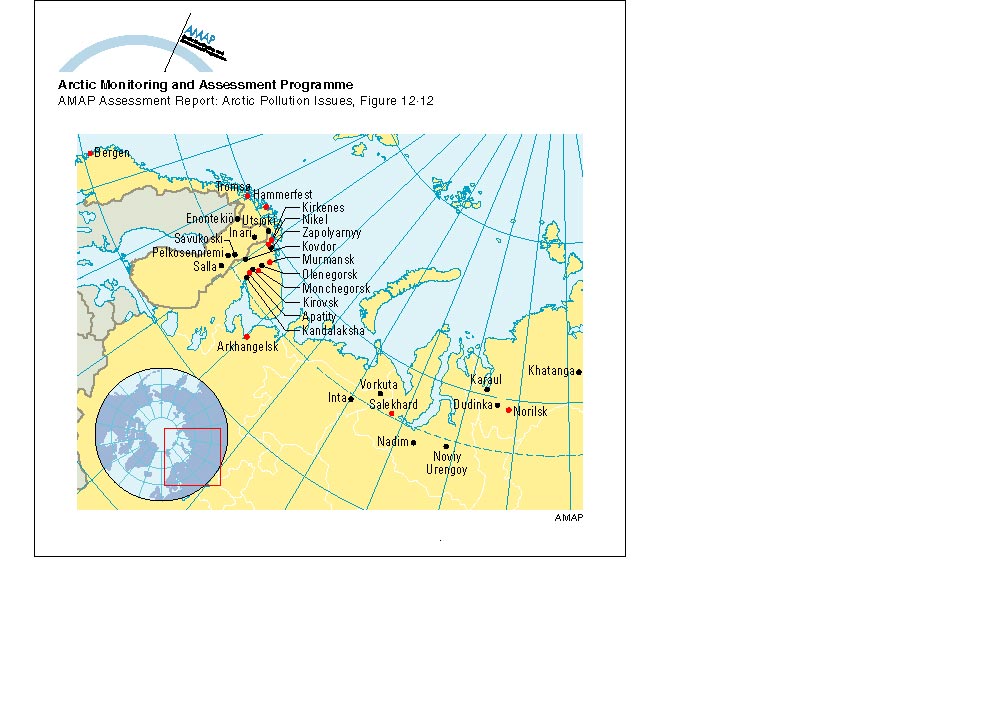 Human health study locations in Arctic Norway, Russia and Finland; red dots indicate the main communities studied under the AMAP monitoring programme
