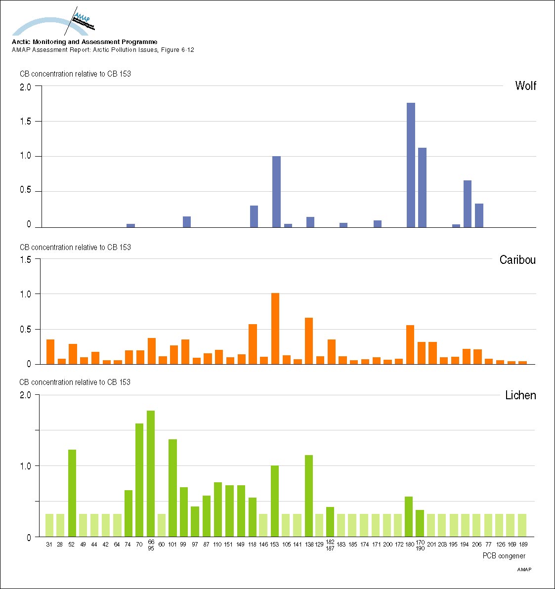 Concentrations of PCB congeners relative to PCB congener 153 for lichen, caribou, and wolf in the Bathurst herd, Canada The light bars denote that the congener was not detected