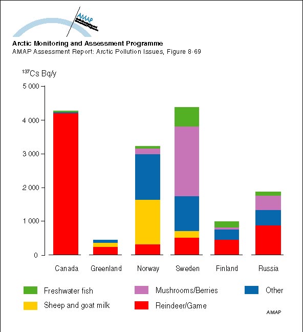 The relative contribution to the 137Cs content of the diet of the ‘average’ population of various Arctic areas for the period 1990 to 1994