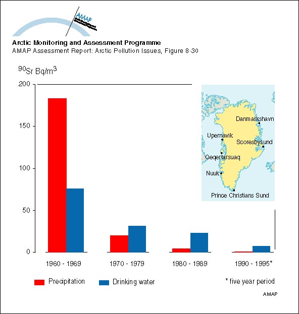 Ten-year averages of 90Sr activity concentrations in drinking water and precipitation in Greenland