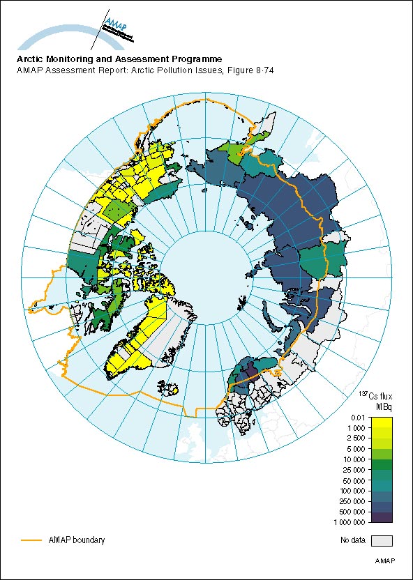 Spatial trends in the net flux from reindeer meat in different Arctic areas, for the first year after an assumed uniform deposition of 100 kBq/m2