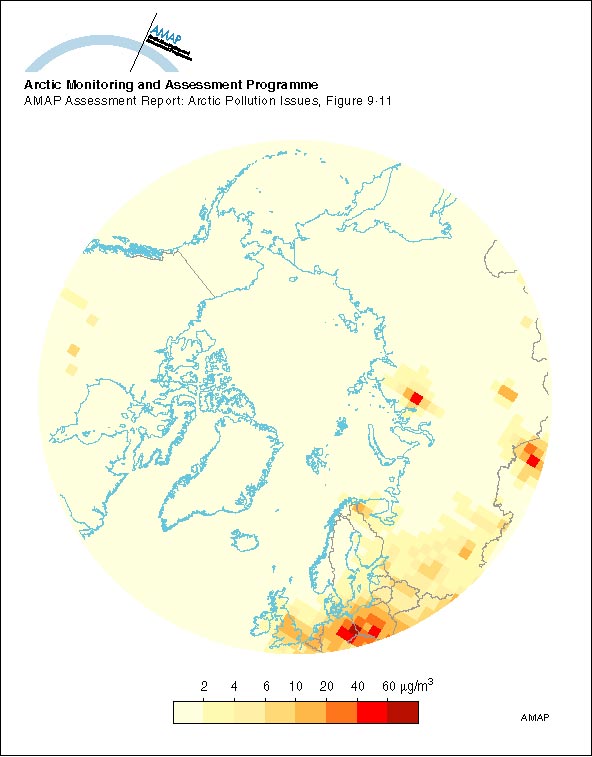 The predicted (1988) average surface air sulfur dioxide concentrations in the Arctic