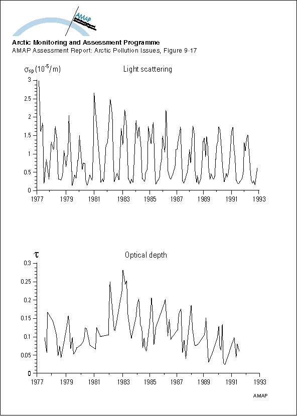 Bodhaine, B.A. and E.G. Dutton, 1993. A long-term decrease in Arctic haze at Barrow, Alaska. Geophys. Res. Lett. 20(10): 947-950. (AAR Figure 9.17)