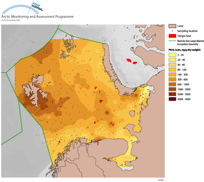 PAH concentration (ng/g dry weight) in bottom sediments of the Barents Sea. Fine structure and hot spots shown on interpolated maps, such as this, should be viewed with caution, however the general trends, such as the high concentrations around Svalbard are clear. Individual data are shown in map on next page. Grey shades indicate water depth