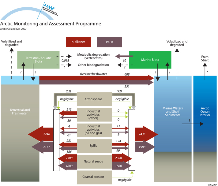 Schematic diagram of the petroleum hydrocarbon budget of the Arctic; inputs via the atmosphere are primarily non-petrogenic. Units: tonnes per year