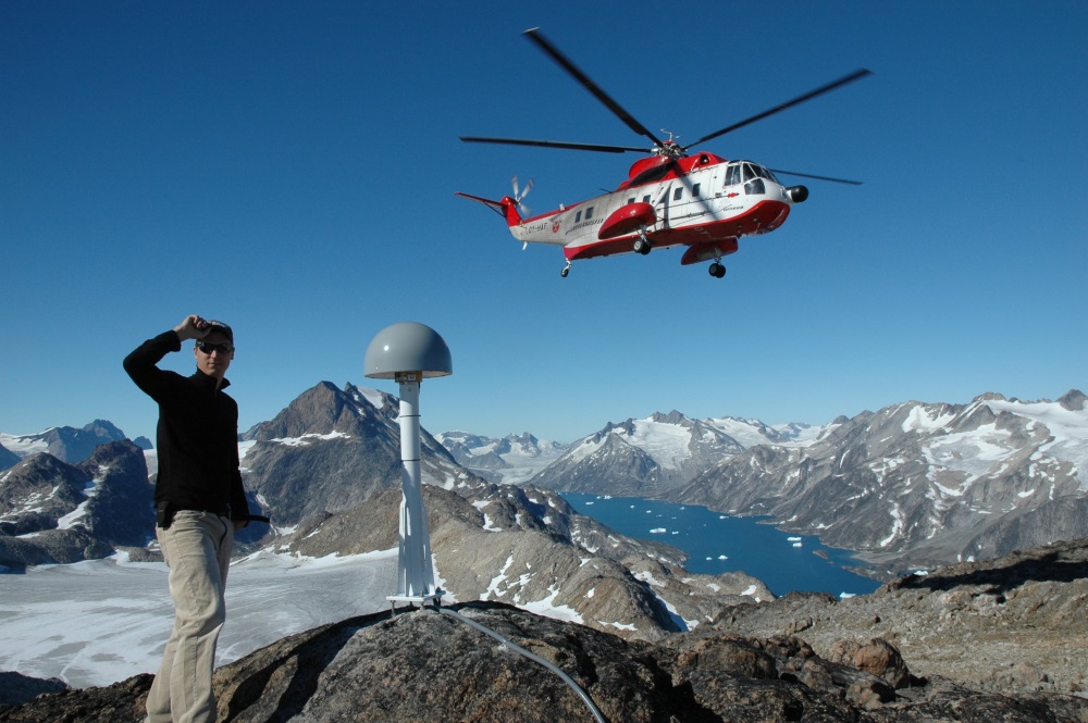 Scientist from Ohio State University awaiting pick-up after installing a GNET GPS station on Timmiariit Island, SE Greenland, as part of the research efforts to estimate ice mass changes in the Greenland Ice Sheet