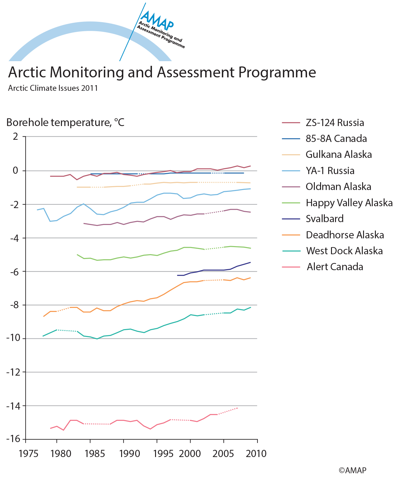 The temperature of permafrost is measured at the shallowest depth where the temperature does not change throughout the year. This chart shows permafrost temperatures recorded at ten sites in Russia, Alaska, Canada and Svalbard. Most of these temperature sequences show warming, typically by between 0.5 and 2 centigrades over the last two to three decades, with greater temperature increases at colder sites. The range in permafrost temperatures between sites is 1 centigrades less than it was 30 years ago. These changes are linked to changes in average air temperature. Over western North America, the rate of warming has slowed since 1998, which was the year with the highest air.