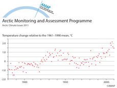 Continuous instrumental records of Arctic air temperatures began around 1880. At most locations, temperatures measured since 2005 have been higher than at any time in the historical record. Annual average temperatures across the whole Arctic have been consistently around 1.5 centigrades or more higher than they were from 1961 to 1990. These temperatures exceed even those experienced during a warm period in the 1930s and 1940s. The increase in average temperature since 1980 has been twice as high over the Arctic as it has been over the rest of the world. In attributing the cause of warming in the Arctic, SWIPA refers to the findings of the Fourth Assessment Report of the Intergovernmental Panel on Climate Change (IPCC). This states that "Most of the observed increase in global average temperatures since the mid-20th century is very likely [> 90% probability] due to the observed increase in anthropogenic GHG [greenhouse gas] concentrations".
