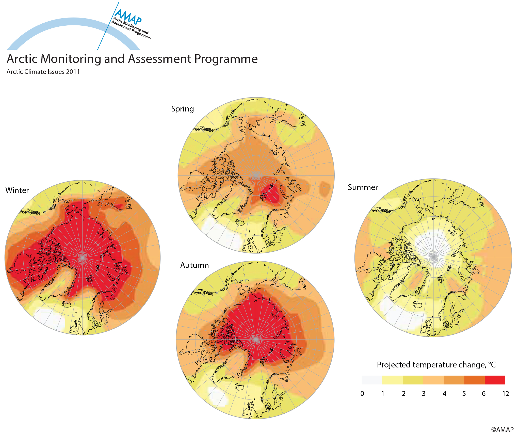 Average surface air temperatures in the Arctic have warmed at around twice the rate of the global average over the past few decades. Multiple climate models lead us to expect that this trend will continue and the Arctic will warm faster than anywhere else in the world. Average Arctic air temperatures in autumn and winter are expected to increase by between 3 and 6 centigrades by the late 21st century (2080). The range refers to the temperature change experienced in different regions of the Arctic, including land and ocean areas. For most land areas, warming in winter is projected to be slightly less than it is over the ocean - between 2 and 3 centigrades by 2080. The greatest increases are expected in autumn and winter over areas where sea ice is being lost.