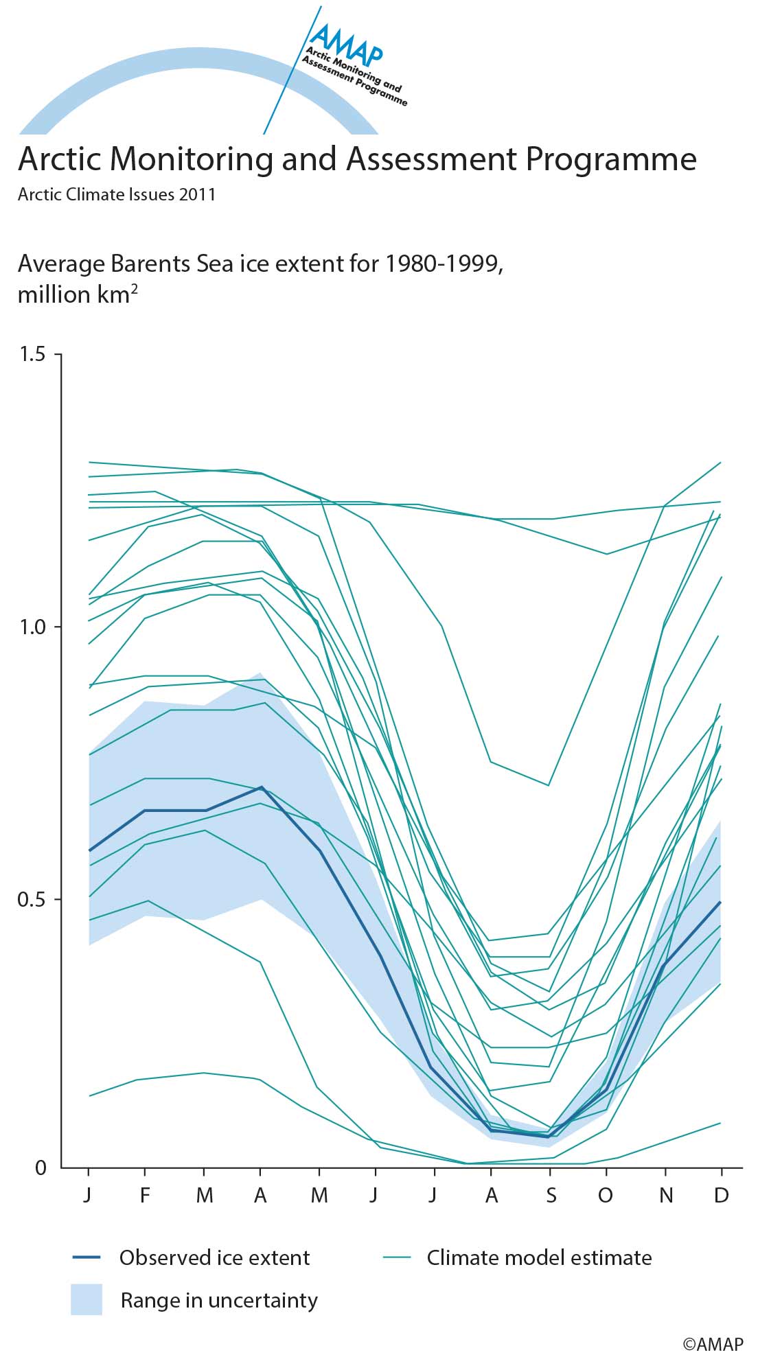 Climate scientists deal with uncertainty by presenting a range of possible futures. The greater the range of possibilities, the more uncertain the result. As an example the Barents Sea ice extent 1980-1999 over the year shows great variation from year to year, and the range of uncertainity (which varies over the year) is presented in this figure, together with current model estimates, from multiple climate model outputs.