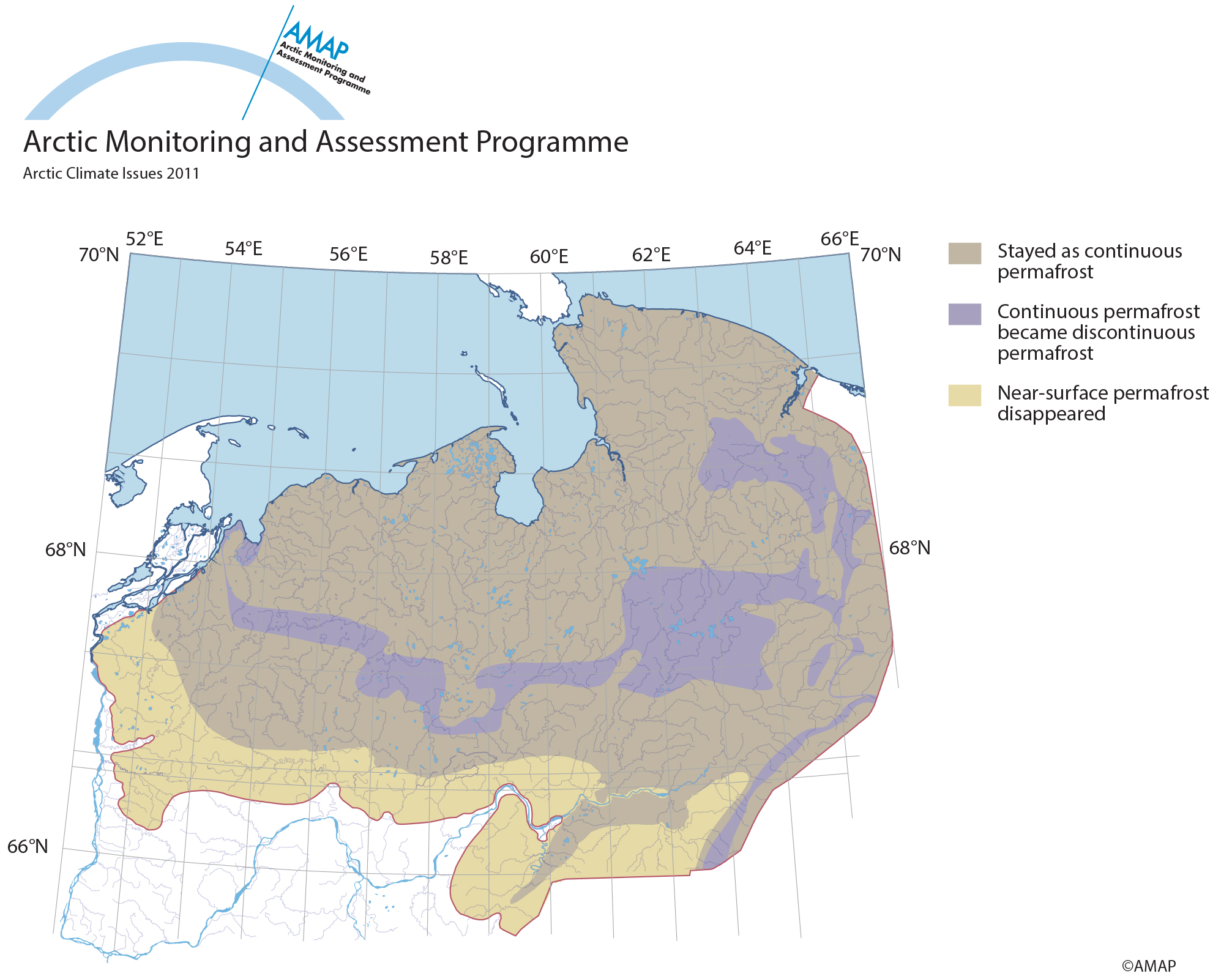 Temperature records from boreholes going back four decades show that permafrost under Arctic lands has warmed by up to 2 centigrades, particularly in colder sites (typical permafrost temperatures range from -16 centigrades to just below 0 centigrades, depending on the location). The upper few metres of permafrost have disappeared altogether since 1970 at several low Arctic sites. In some areas with a shallow layer of permafrost, it has thawed completely. The southern limit of permafrost moved northward by 30 to 80 km in western Russia between 1970 and 2005, for instance, as presented in this figure.