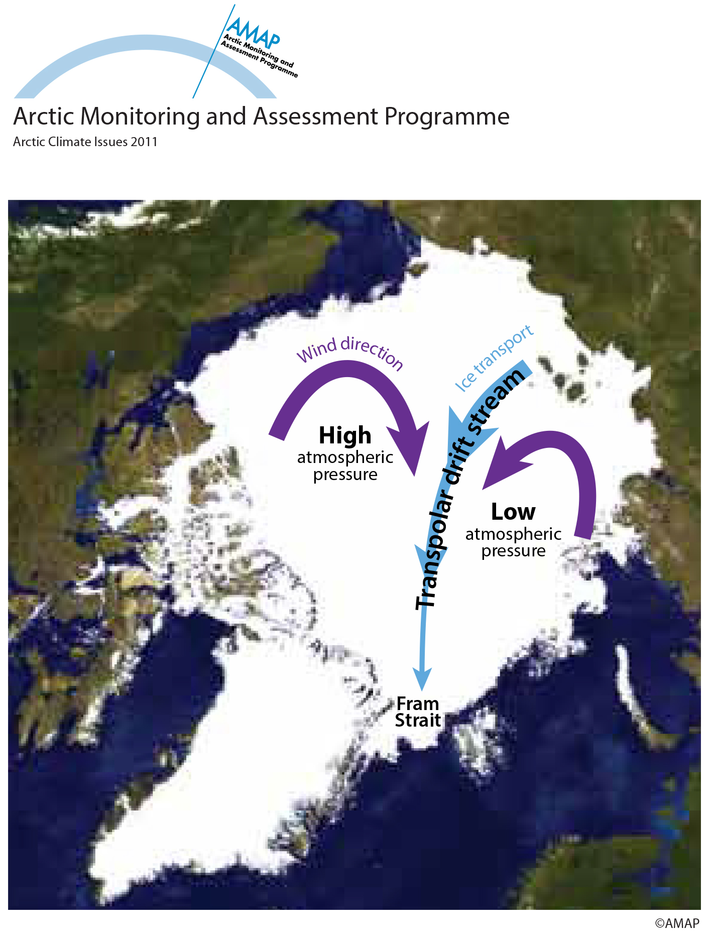 A previously unseen weather pattern has been observed over the Arctic by several groups of scientists since 2006. Some have called it the 'Arctic Rapid Change Pattern (others term it a 'dipole anomaly). It is characterized by low air pressure developing during the winter months off the north Russian coast and higher pressure on the opposite side of the Arctic Ocean, over Greenland and north of Canada. These conditions create winds that blow across the North Pole from Greenland towards Russia, weakening the ocean circulation in the Beaufort Gyre. The Beaufort Gyre is a slowly spinning whorl of cold, relatively fresh water and sea ice, partly driven by winds. It tends to hold sea ice in place for several years. Weaken the Beaufort Gyre and multi-year sea ice is more inclined to spill out through the Fram Strait into the North Atlantic, melting as it goes. This appears to be happening. Rapid export of sea ice from the Arctic Ocean to the Atlantic has been observed in recent years.