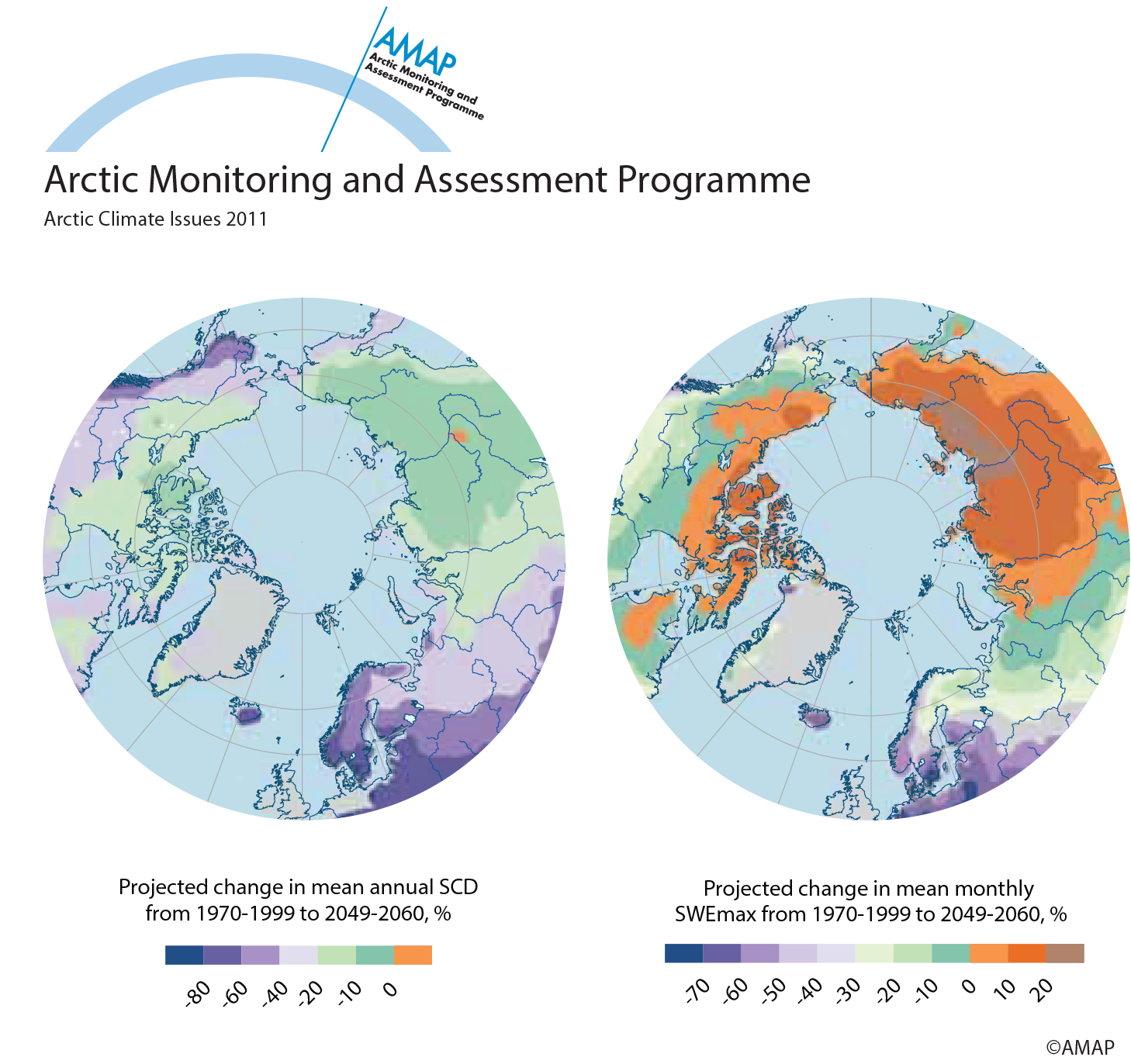 Projected changes in snow-cover duration (left) and the total amount of snow falling (right) over the Arctic by the mid-21st century (2049-2060 relative to 1970-1999)